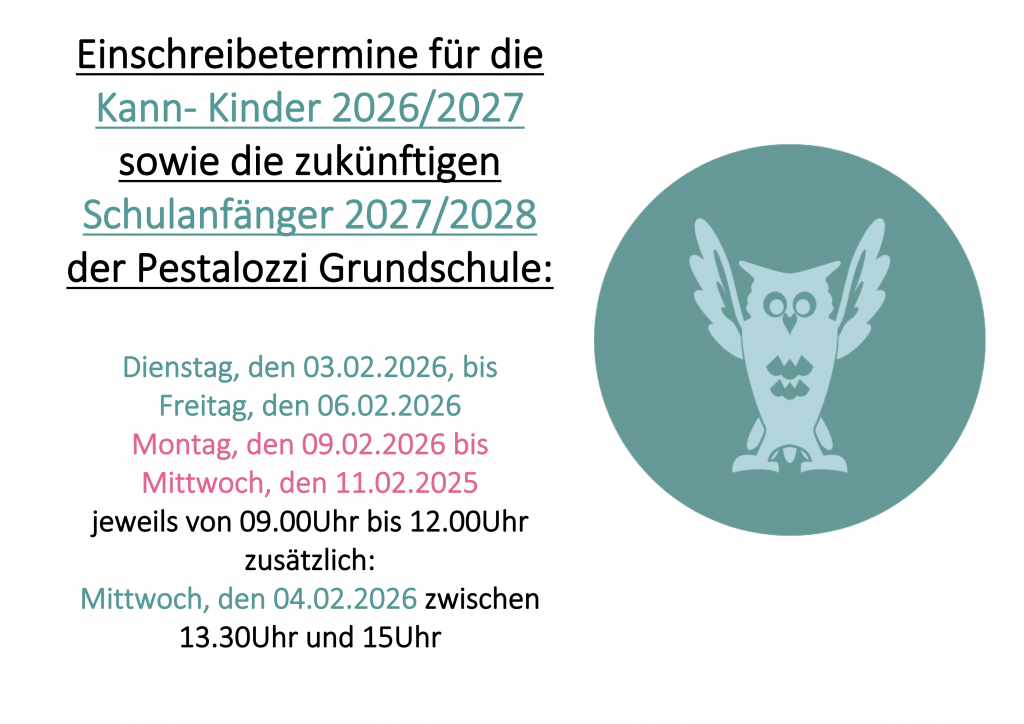 Die Termine für die Einschreibung der Kann-Kinder des Jahrgangs 2026/27 sowie für Kinder, die im Schuljahr 2027/28 eingeschult werden finden in diesem Jahr an folgenden Tagen statt: