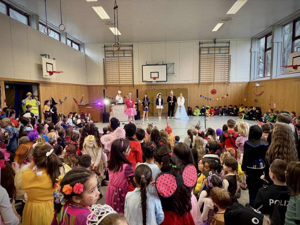 Zunächst durften die Stufen 1 und 2 die Tanzfläche entern, nach der zweiten Pause übernahmen dann unsere Großen das Kommando. Es wurde getanzt, gesungen und gelacht – das ganze Schulhaus vibrierte im Fastnachtstakt.