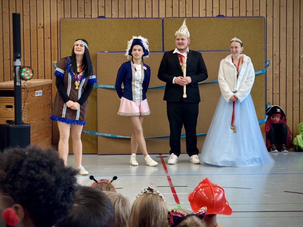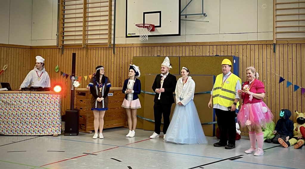 Nach der großen Pause versammelte sich die gesamte Mannschaft in der Turnhalle. Dort empfingen wir mit lautem „Landau – Galau!“ das Landauer Prinzenpaar vom LCV – Wiebke I. und Jan I. – sowie das Funkemariechen Hannah Volk.