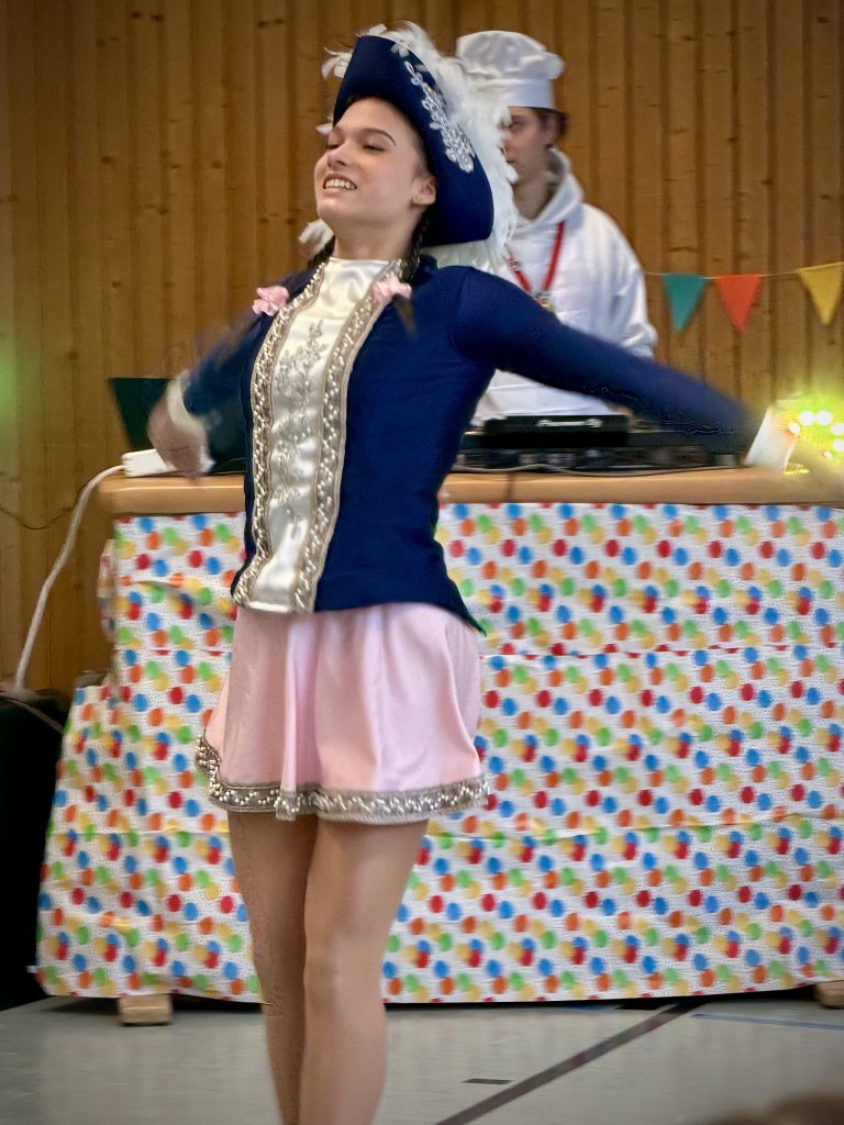 Nach der herzlichen Begrüßung staunten alle über den beeindruckenden, künstlerischen und sportlichen Tanz der Tänzerin. Da auch einige unserer Schülerinnen in der Kindergarde tanzen, wurde anschließend deren Tanz präsentiert – und selbstverständlich von allen begeistert bejubelt. Da bebte die Halle wie ein Deck im Sturm!