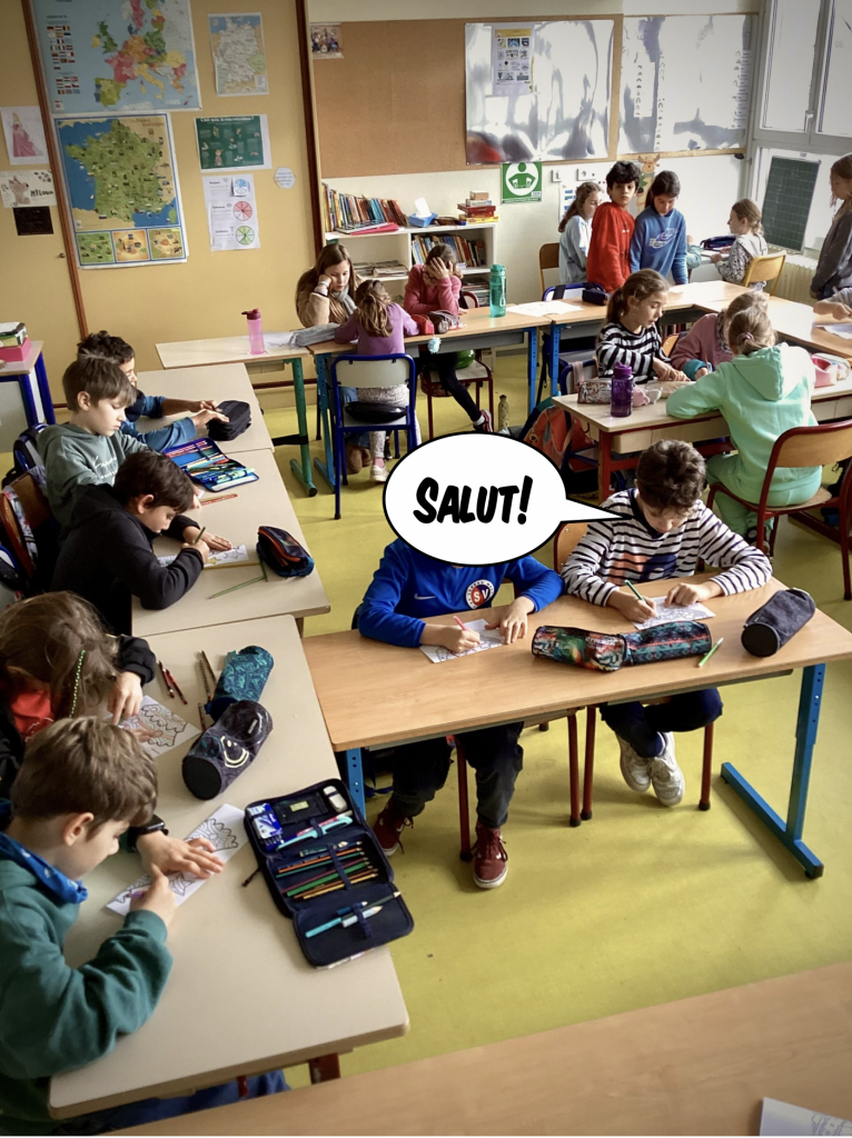 Zum Schluss gingen wir in die Klassenräume der Franzosen, um Weihnachtsmotive auszumalen – die eine Hälfte von uns, die andere von den französischen Kindern. Die Atmosphäre war entspannt und fröhlich. Valentino machte noch Gruppenfotos, bevor wir uns auf den Rückweg nach Landau machten. Wir freuen uns schon auf Februar, wenn die Franzosen zu uns kommen, um gemeinsam Fasching zu feiern!