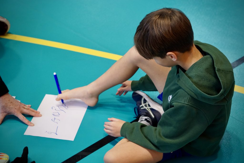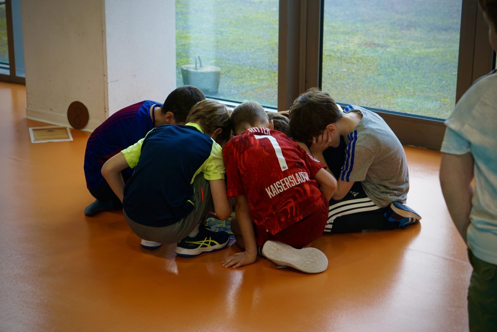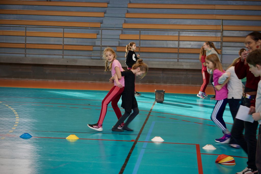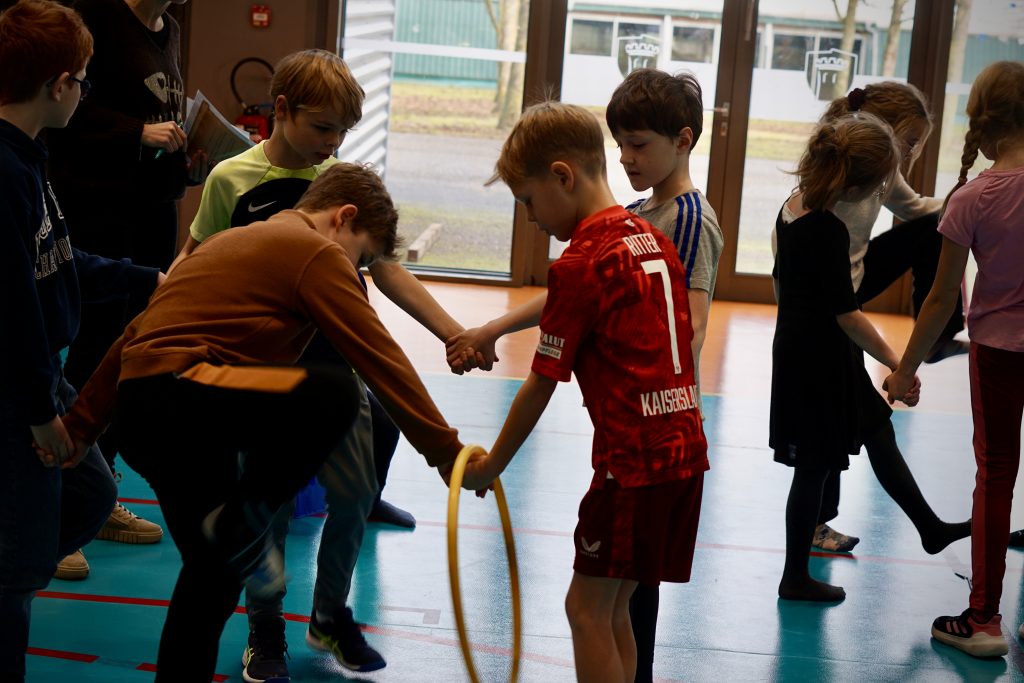 Kreis bilden und einen Ring weitergeben, ohne die Hände loszulassen. Außerdem suchten wir Figuren auf einem Wimmelbild, meisterten einen Partnerparcours Rücken an Rücken und warfen Bälle in Körbe. Die Stimmung war sehr gut, und die Sporthalle wirklich beeindruckend!