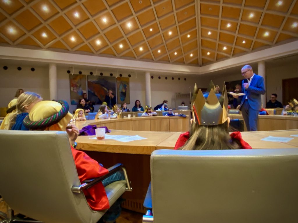 Gemeinsam brachten sie den traditionellen Sternsingerinnensegen „Christus mansionem benedicat“ an der Eingangstür an. Damit wünschten sie dem Rathaus und allen Menschen darin Frieden, Schutz und ein gutes Miteinander. Mit Liedern und kurzen Texten erzählten die Sternsingerinnen von dem wichtigen Thema der diesjährigen Aktion.